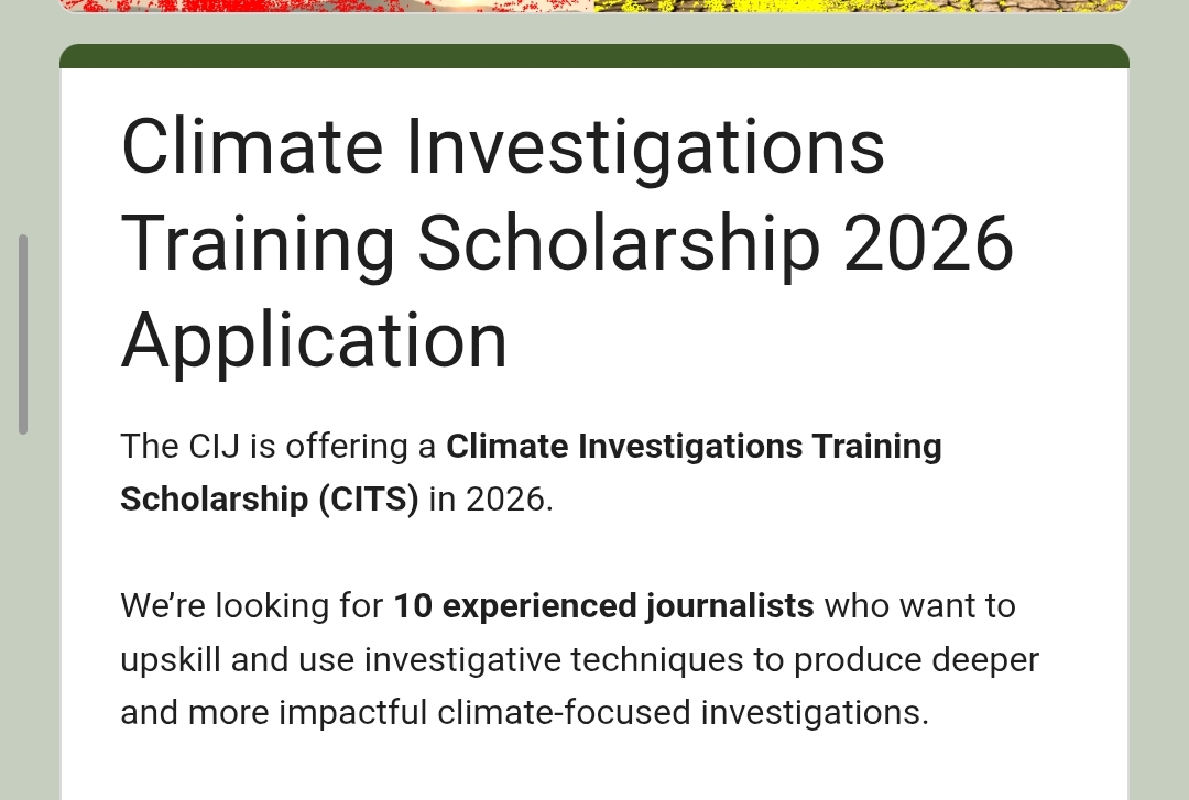 DEADLINE: FEBRUARY 11, 2026 — The Centre for Investigative Journalism is currently accepting applications for this 2026 Climate Investigations Training Scholarship.