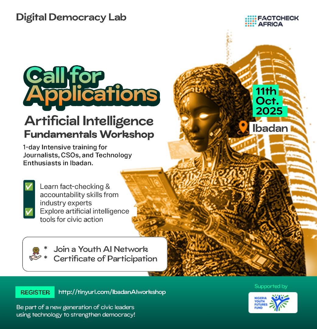 FactCheckAfrica, with support from the Nigeria Youth Futures Fund (NYFF), seeks applications for its AI Fundamentals Workshop in Ibadan, Oyo State.