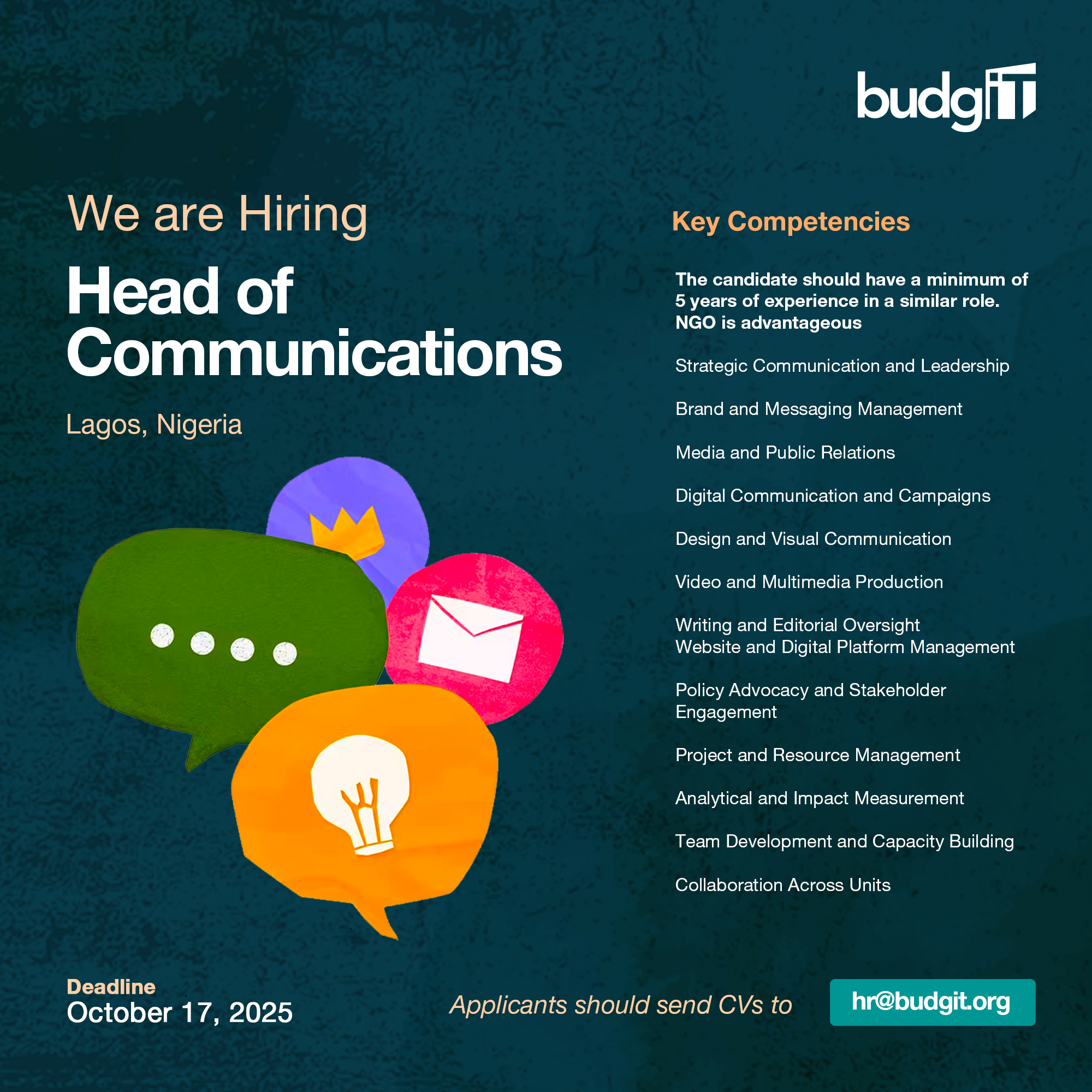 DEADLINE: OCTOBER 17, 2025 — BudgIT Foundation, a civic tech organisation, is hiring Head of Communications in Lagos State.