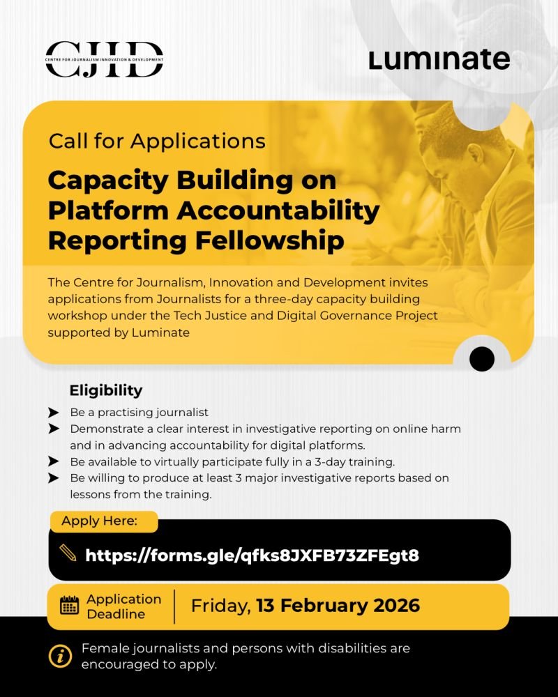 DEADLINE: FEBRUARY 13, 2026 — The Centre for Journalism, Innovation and Development (CJID) invites journalists to apply for this three-day…