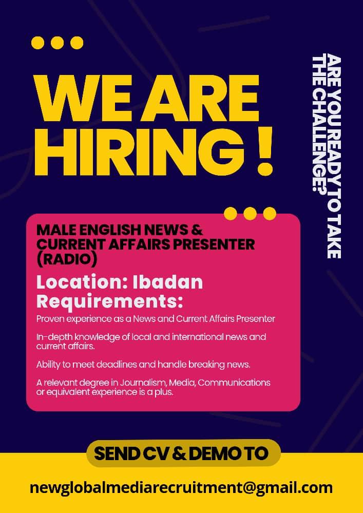 A radio station in Ibadan, Oyo State, seeks a male English News & Current Affairs Presenter. This role is for…