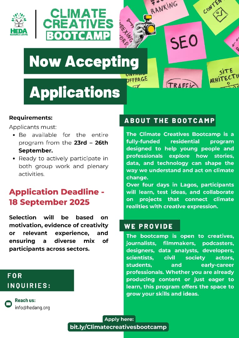 DEADLINE: SEPTEMBER 18, 2025 — The Climate Creatives Bootcamp, a fully-funded residential programme, seeks young people who want to experiment with new ways of telling climate stories.