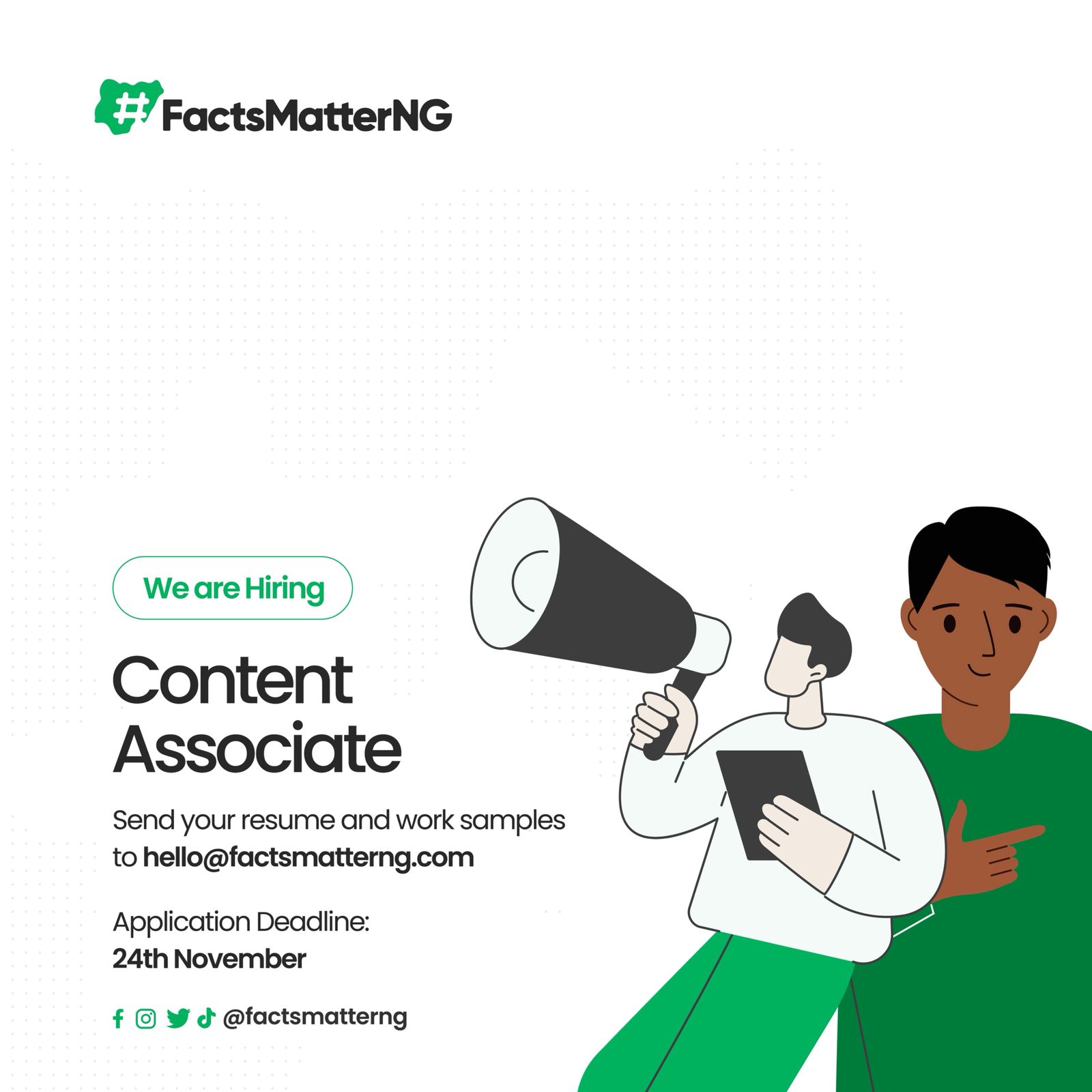 DEADLINE: NOVEMBER 24, 2024 — FactsMatterNG is looking for a content associate to join its remote team.