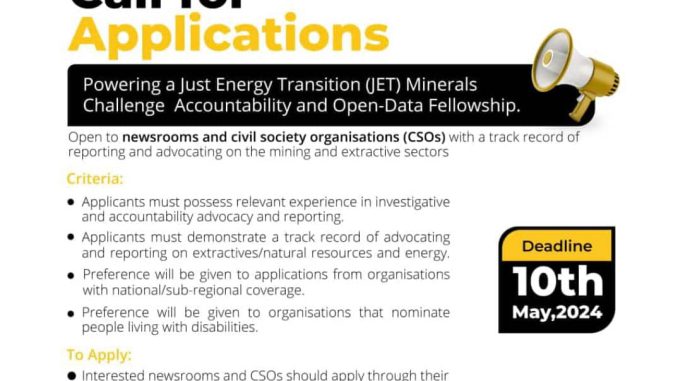DEADLINE: MAY 10, 2024 — The Centre for Journalism Innovation and Development (CJID) wants CSOs and newsrooms to apply its “Just Energy Transition (JET) Minerals Challenge” Accountability and Open-Data Fellowship.