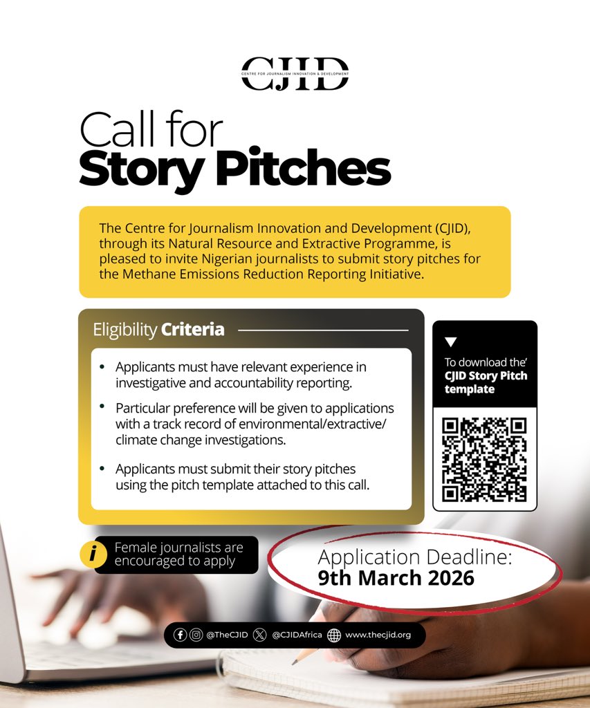 DEADLINE: MARCH 9, 2026 — The Centre for Journalism Innovation and Development (CJID) invites Nigerian journalists to submit story pitches for the Methane Emissions Reduction Reporting Initiative.
