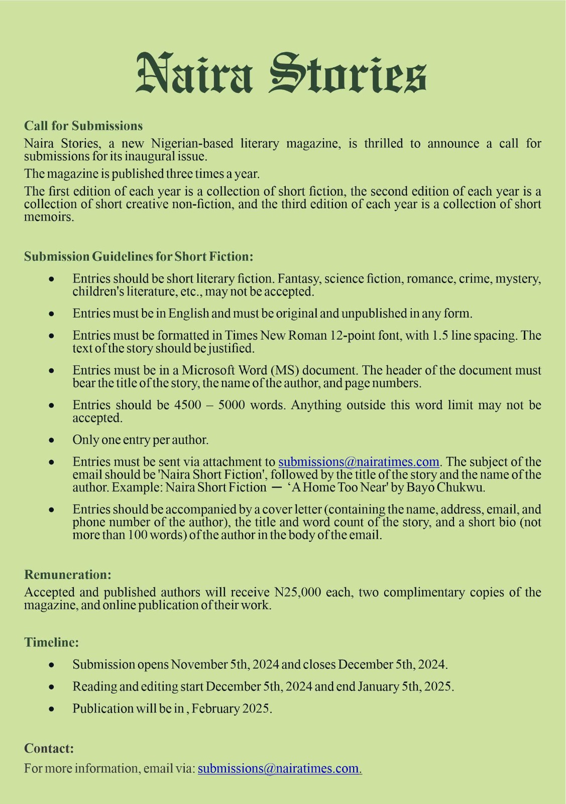 DEADLINE: DECEMBER 5, 2024 — Naira Stories seeks short literary fiction for its inaugural issue.