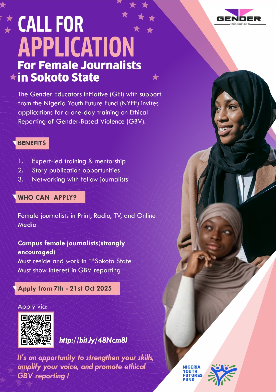 DEADLINE: OCTOBER 21, 2025 — Female journalists based in Sokoto State who are passionate about ethical Gender-Based Violence (GBV) reporting can apply for this training.