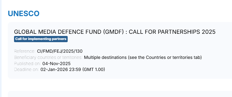 DEADLINE: JANUARY 2, 2026 — The Global Media Defence Fund of the United Nations Educational, Scientific and Cultural Organisation (UNESCO) is accepting proposals.