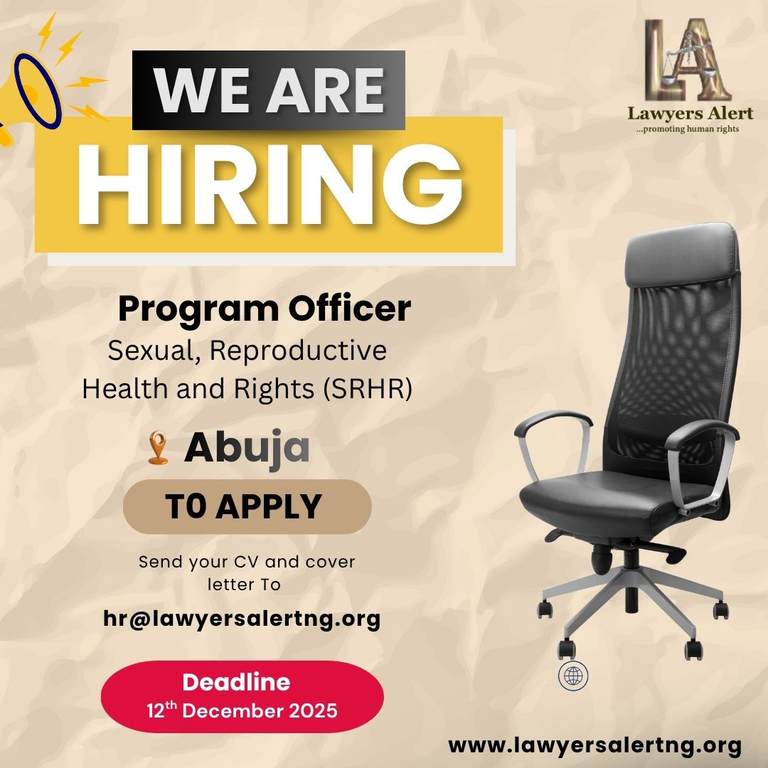 DEADLINE: DECEMBER 12, 2025 — Lawyers Alert, an organisation working to promote human rights, seeks a passionate and experienced Programme Officer based in Abuja to support its Sexual and Reproductive Health & Rights (SRHR) projects.